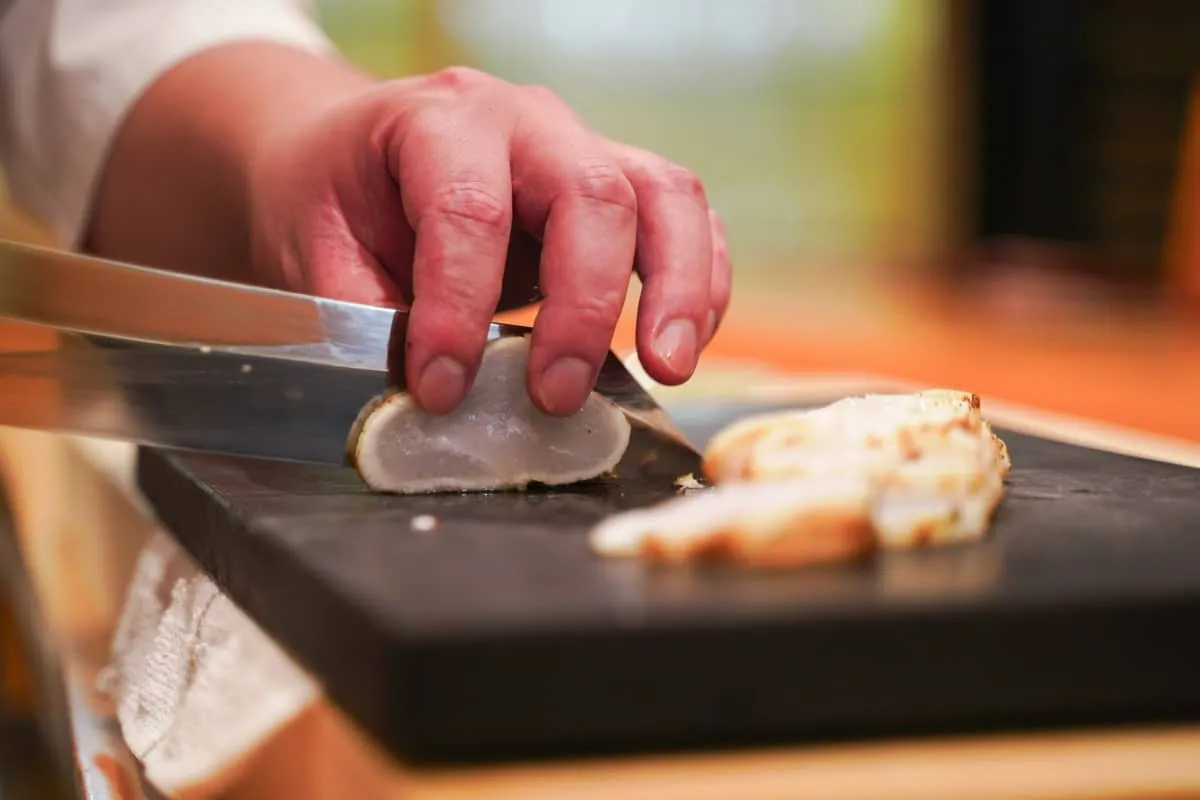 五島列島産のボラの卵を使い、手間暇をかけて仕上げた自家製カラスミは、毎年多くの方に喜んでいただいております。塩加減や乾燥の具合を丁寧に見極め、旨味を凝縮させたカラスミは、口に含むと濃厚な風味が広がり、日本酒との相性が抜群です。カラスミは単体で楽しむだけでなく、その日の仕入れ状況に合わせて手掛ける日本料理やほかの海鮮とのハーモニーにより、さらに奥行きのある味わいが生まれます。こだわりの料理ばかりで、長崎での接待や特別な日の会食にもぴったりです。